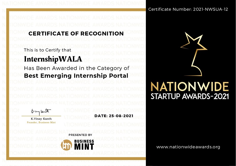 InternshipWala.com is an ISO Certified EdTech company for Internships, Trainings and Projects, is registered under the Ministry of MSME, Government of India and is registered with the AICTE National Internship Portal. Recognized for excellence, InternshipWala received the "Best Emerging Internship Portal - 2021" accolade at the NATIONWIDE STARTUP AWARDS - 2021, presented by BUSINESS MINT. Additionally, the company has been honored as "India's most trusted online platform for Internship," a testament to its commitment to providing high-quality training and internships.